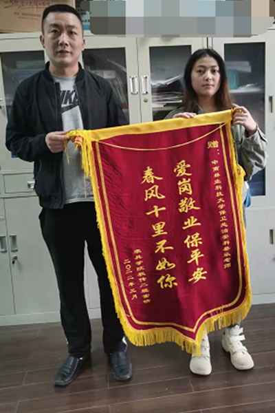 2022年3月17日,保卫处治安科蔡乐同志收到了一份特殊的礼物——一面由家俱与艺术设计学院雷晴同学赠送的“爱岗敬业保平安,春风十里不如你”的锦旗!