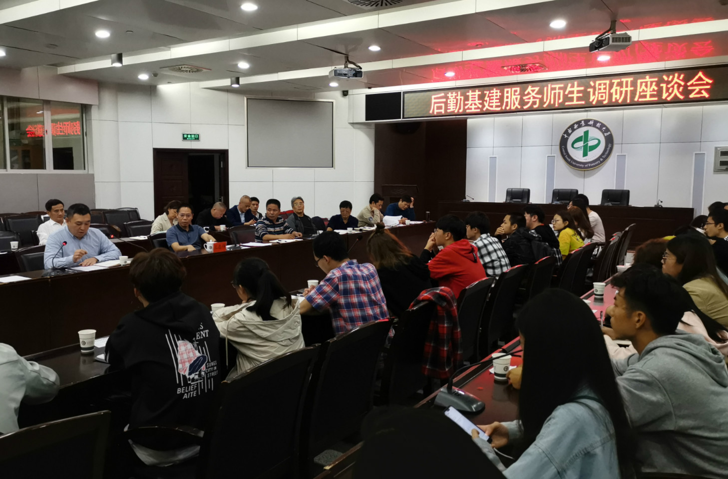 10月14日晚上,学校后勤基建服务师生调研座谈会在崇德楼四楼四会议室召开。学校党委委员、副校长王忠伟主持座谈会并讲话,后勤管理处领导班子、基建处主要领导、后勤有关科室负责人、部分学生代表及天创物业负责人参加了座谈会。