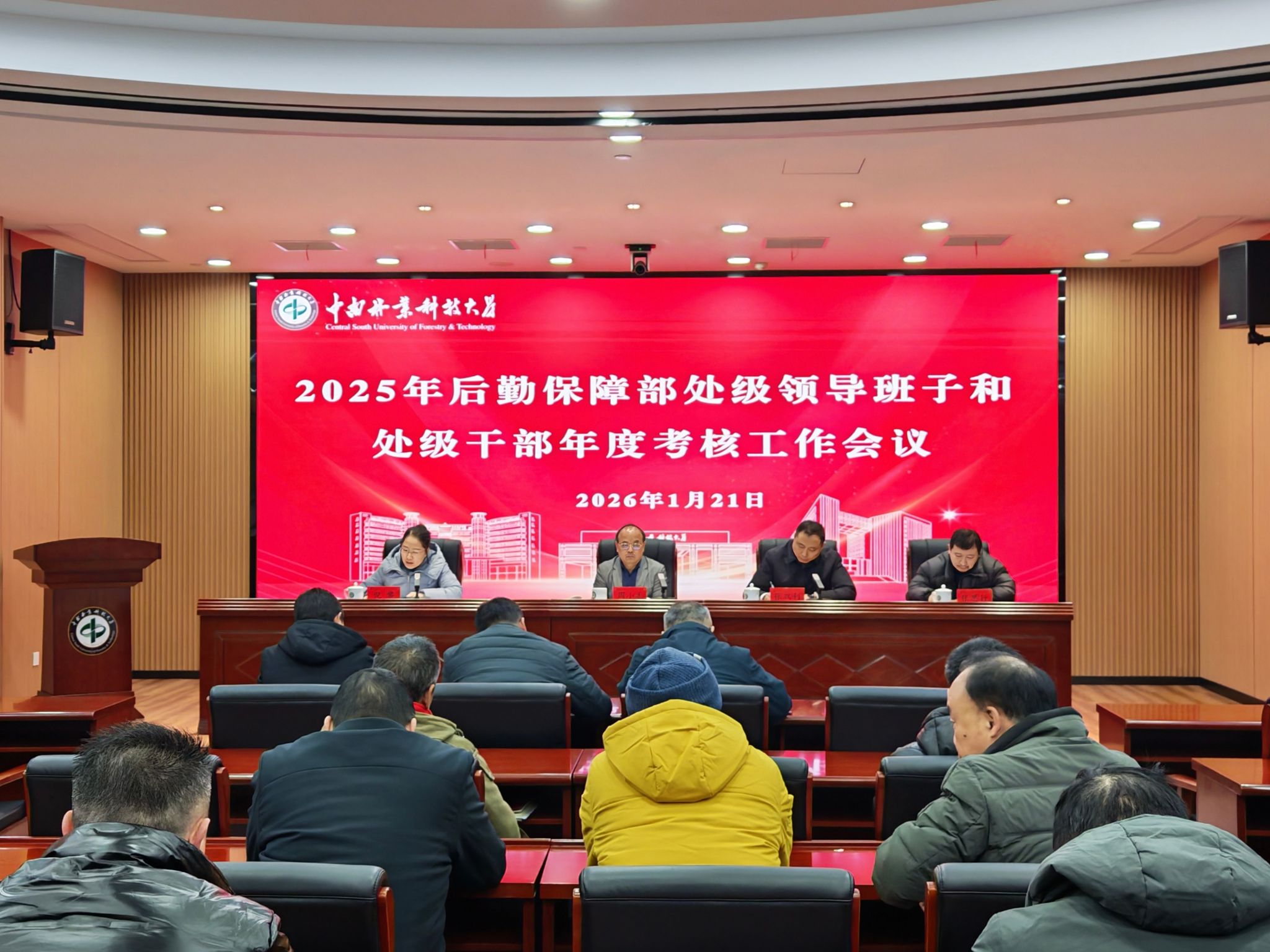 2026年1月21日上午,后勤保障部2025年处级领导班子和处级干部考核工作会议在崇德楼四楼4会议室召开。考核工作组组长周小毛副校长出席会议并讲话,考核工作组成员、党政办副主任倪黎主持会议,后勤保障部全体职工参会。
