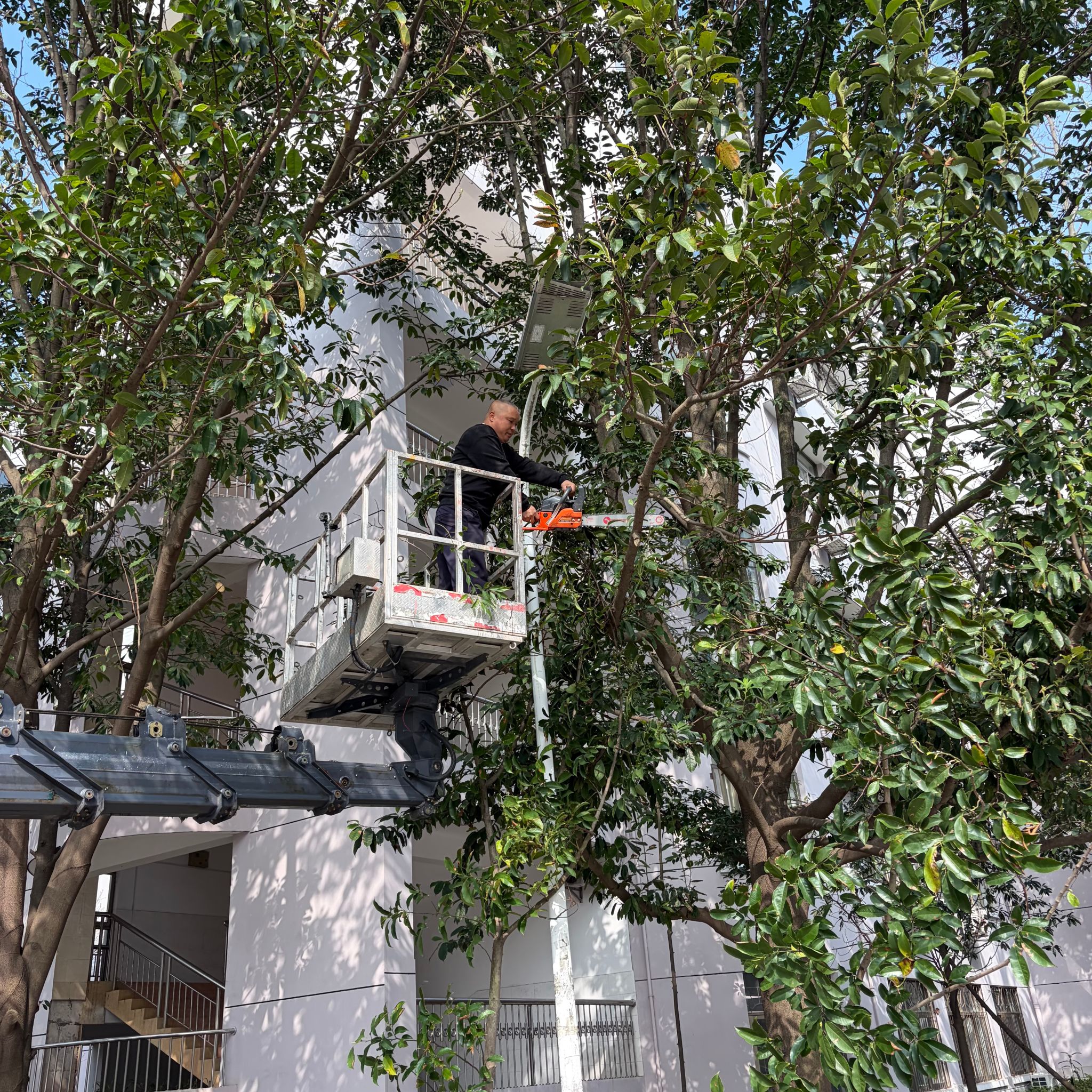 随着树木生长,部分校园行道树枝叶繁茂,既遮挡路灯、监控等设施,影响通行与采光,又因枝条过密,在大风、降雨天气易发生断裂坠落,存在一定安全隐患。为此,工作人员借助高空作业车、高枝锯等专业设备,规范开展高空修剪作业,及时消除安全风险。